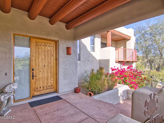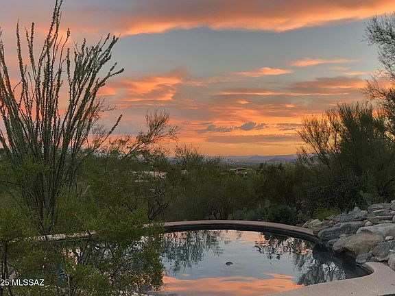 Experience luxury Tucson foothills living in this custom-built southwest home. Twinkling city views, serene mountain vistas and captivating sunsets await you. This well-maintained home features a luxurious primary suite with two balconies that provide breathtaking mountain views and dazzling city lights; cozy wood burning fireplace, plus a spacious bathroom suite with separate sinks, jetted jacuzzi tub, glass block-enclosed stone shower and huge walk-in closet with built-in shelving. An entertainer's dream. The gourmet kitchen is fully appointed with abundant pantry space, appliance garage and pull-out shelving along with 2 ovens, 2 dishwashers, & large center island. The formal dining room with enclosed built-in wet bar and wine refrigerator opens to a spacious window-lined living room with stunning mountain views.