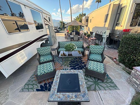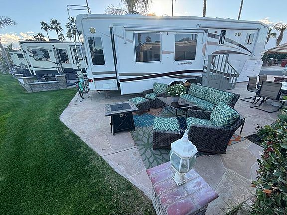 Welcome to exquisite lot 1080. Located near hole #7 offering golf course and mountain views. Close to ES Clubhouse where you can partake in pickle ball, pool, spa and a wide variety of social events. Lot 1080 shows so beautifully with customized cool deck overlaid on top of cement, modern wicker outdoor furniture, firepit, year old bbq and an eating table for 6. The outdoor decor is so tastefully done in a fresh green and blue color scheme. Sitting on lot 1080 is the ever so popular 2006 Teton Frontier 39'rv. This Teton is definitely one of the lightest, brightest, cheeriest and classiest Tetons I've yet to see. Newer white/gray modern cabinetry, whitewashed hardwood flooring, tastefully chic kitchen back splash, washer, residential potty, residential refrigerator, king size bed. The indoor fabrics and decor scream '' This is my happy place here at orps''Truly a must see!
