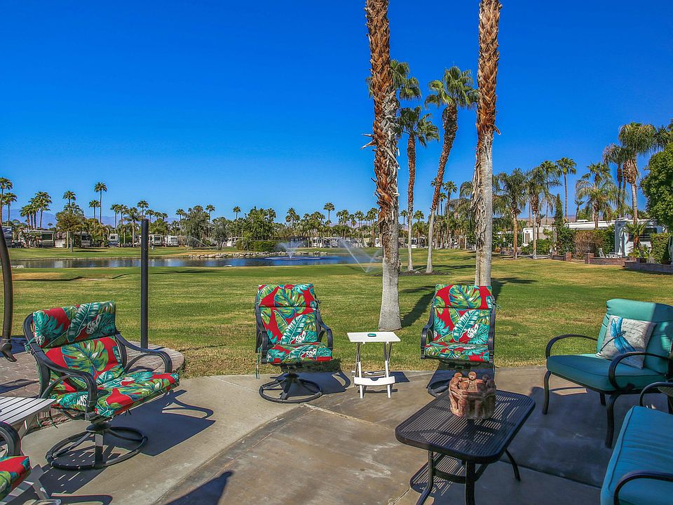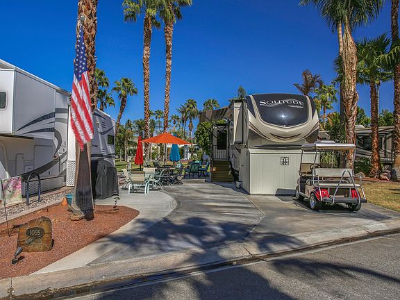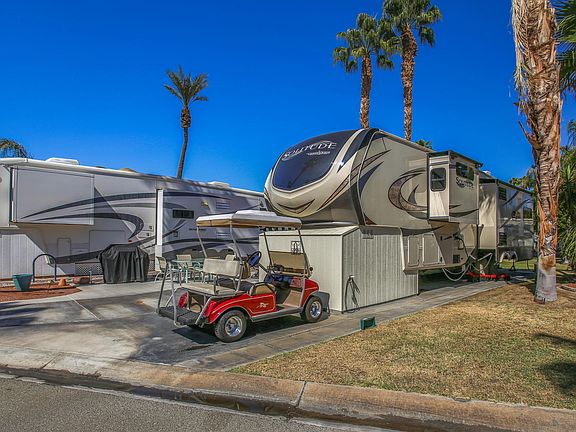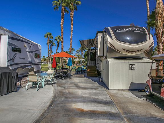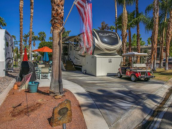 Live well here! On the back 9 golf course, the fifth wheel was specifically purchased for this lot. Lot $115,000. RV $65,000. SOLD AS A PACKAGE: $180,000. A 2019, 42.5' Grand Design Solitude, ST372WB with butter soft honey colored leather sofa and recliners. Rear living, mid master, front double sink vanity, walk in closet. Windows galore. Look out any window and see three surrounding mountains ranges. The views surpass anything. Lot 1099 on one of the lakes at Outdoor Resorts Palm Springs looks on a great water fountain feature. The pad has been expanded giving room to park many vehicles or enjoy a huge entertaining area. Doghouse and steps are already built and included in this package.