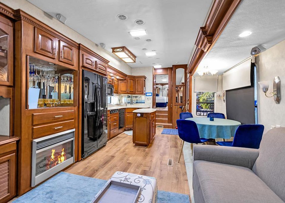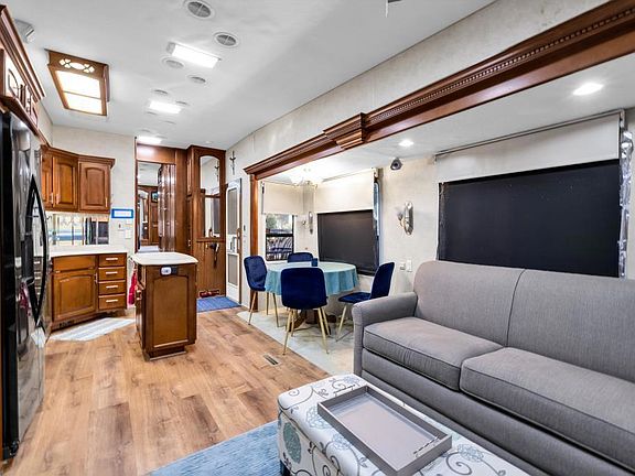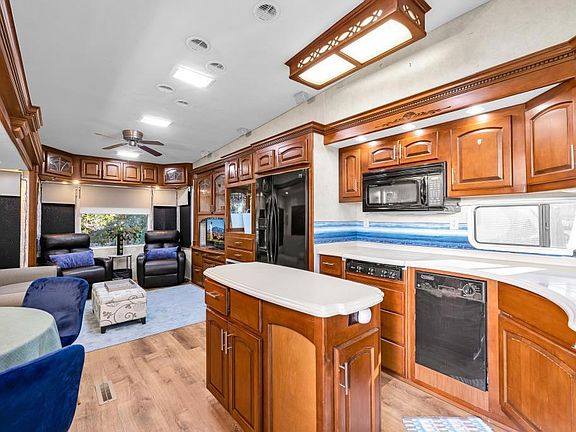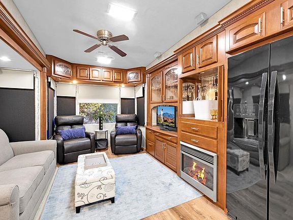 Exceptional 2005 Grand Teton Limited RV and lot package, available in a fun, active community. Located on a convenient street -walking distance to our ES clubhouse. Across from the back nine course. Enjoy luxurious, turnkey living with an upgraded outdoor space featuring a shaded pergola and outdoor TV. The impeccably maintained interior boasts ample storage, a living room with fireplace and bar, a gourmet kitchen with a large island, and a master suite with a new queen bed and private bath.