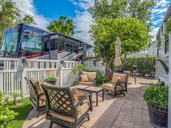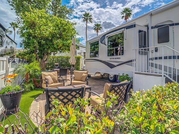 Remodeled lot located close to the clubhouse on a quiet street. This lot has been updated, expanded and it now offers nice privacy with the hedges. Includes: Umbrella w/ stand, patio table & 4 wicker chairs, 4 other large patio chairs and 3 small tables, carpets & more. Outdoor Resorts Palm Springs is a Five Star RV Resort Community combining luxury with affordability. It is a guard gated resort that sits on 137 beautifully landscaped acres with 27 holes of executive golf, 10 tennis courts, 13 pickleball courts, 8 swimming pools, a fully equipped fitness center, espresso bar, sports bar, beauty salon/barber shop, full-service restaurant, convenience store, 2 club houses, activities, special events and so much more.
