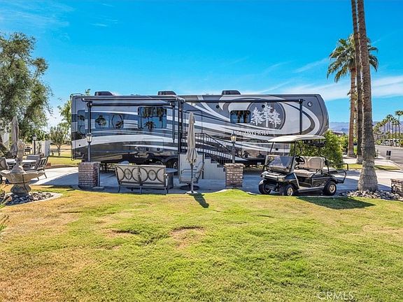 Beautiful Premium Expanded Corner Lot with Luxury Fifth Wheel & Resort Amenities! Discover this premium, low-maintenance expanded corner lot with a peaceful fountain view, located on the 8th tee box of the “Big 18” golf course in the vibrant, guard-gated Outdoor Resorts Palm Springs RV Resort Community. Included is a 2016 Crossroads Redwood Fifth Wheel, a stunning home-on-wheels offering residential quality finishes throughout — tile flooring, leather sofa and dual recliners, fireplace, flat-screen TV, and Jensen surround speakers. The open kitchen boasts granite countertops, full backsplash, center island, real wood cabinetry, electric stove, dishwasher, stainless-steel residential refrigerator, and a coffee & wine bar area. Enjoy meals at the wood dining table for four surrounded by windows with pull-down shades that fill the space with natural light. The king-size bedroom provides abundant wardrobe and drawer space, while the spacious bathroom/dressing area features dual sinks, large shower, and two storage areas (one plumbed for a stackable washer and electric dryer). A cedar-lined closet adds an elegant touch. Step outside to your luxurious patio retreat, complete with a love seat, two swivel chairs with thick cushions, firepit table, dining table for four, two umbrellas, and an additional firepit table — perfect for relaxing or entertaining under the desert sky. A reupholstered Club Car golf cart with cover is also included in this perfectly priced package. Beyond your lot, the resort offers an unmatched lifestyle on 137 beautifully landscaped acres, featuring:27 holes of executive golf, 10 tennis courts and 13 pickleball courts, 8 sparkling swimming pools, fully equipped state of the art fitness center, cafe, on-site salon/barber shop, two clubhouses hosting year-round activities, events, and entertainment. Whether you’re seeking an active social scene or a peaceful retreat, Outdoor Resorts Palm Springs delivers the best of both worlds. This is more than just a lot—it’s a lifestyle!