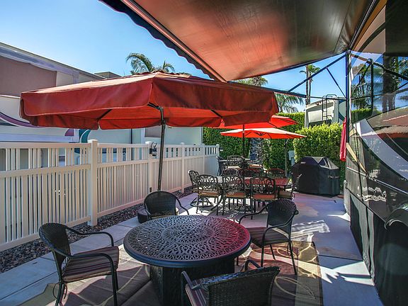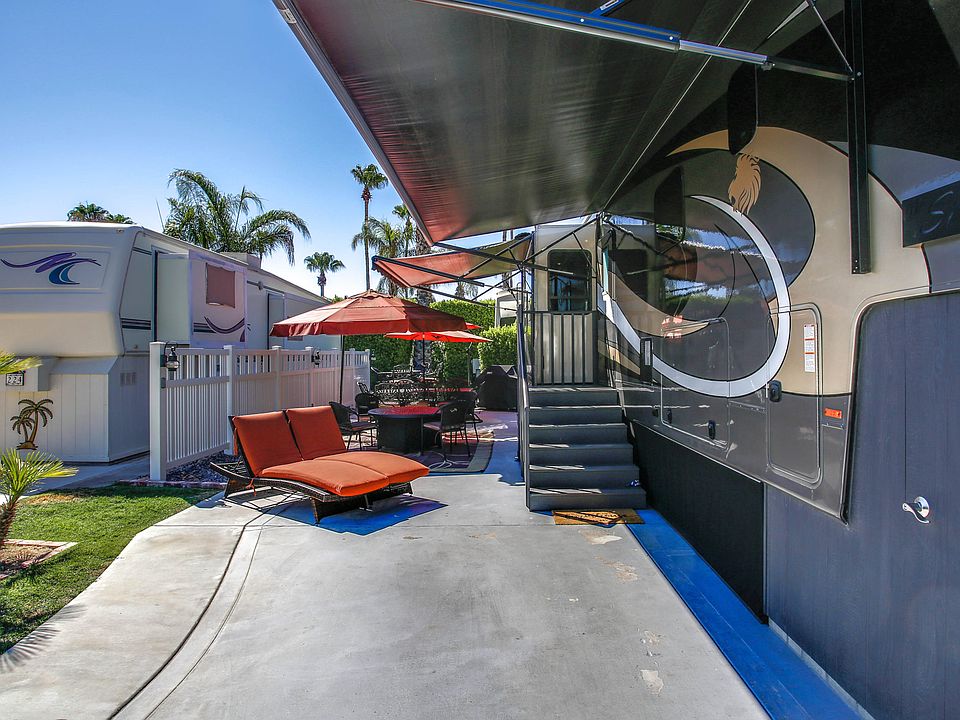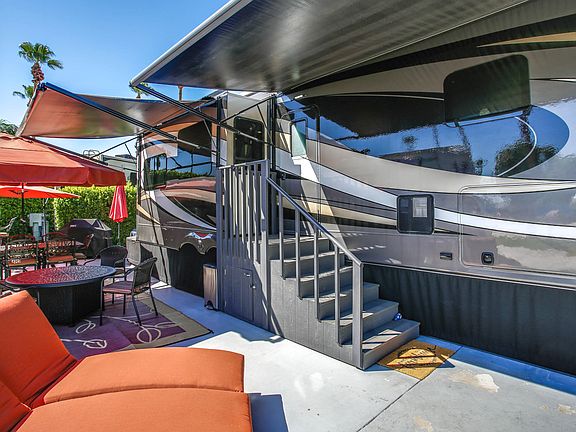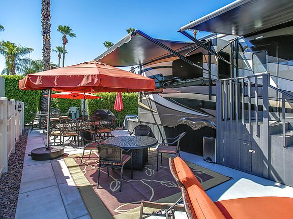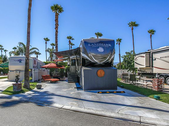 The lot has been extended with new concrete, privacy fencing, new lighting. Beautifully appointed 43' Landmark (sold separately) sitting on north facing lot providing afternoon filtered sun. Close to La Palma clubhouse, seasonal gym, pool, jacuzzi. Easy entrance/exit of the Resort. 2018, 43' LANDMARK. GORGEOUS. $97,000 or as a package with the lot for $152,000. Every upgrade you would choose for yourself. RV is a Heartland Landmark 365 Newport 43' 1.5 bath, king bed, W/D, doghouse, steps and canvas skirting. Outdoor Resorts Palm Springs is a Five Star RV Resort Community combining luxury with affordability. It is a guard gated resort that sits on 137 beautifully landscaped acres with 27 holes of executive golf, 10 tennis courts, 13 pickleball courts, 8 swimming pools, a fully equipped fitness center, espresso bar, sports bar, beauty salon/barber shop, full-service restaurant, convenience store, 2 club houses, activities, special events and so much more.