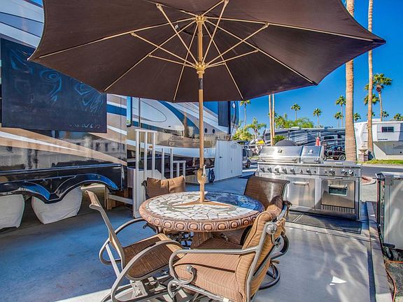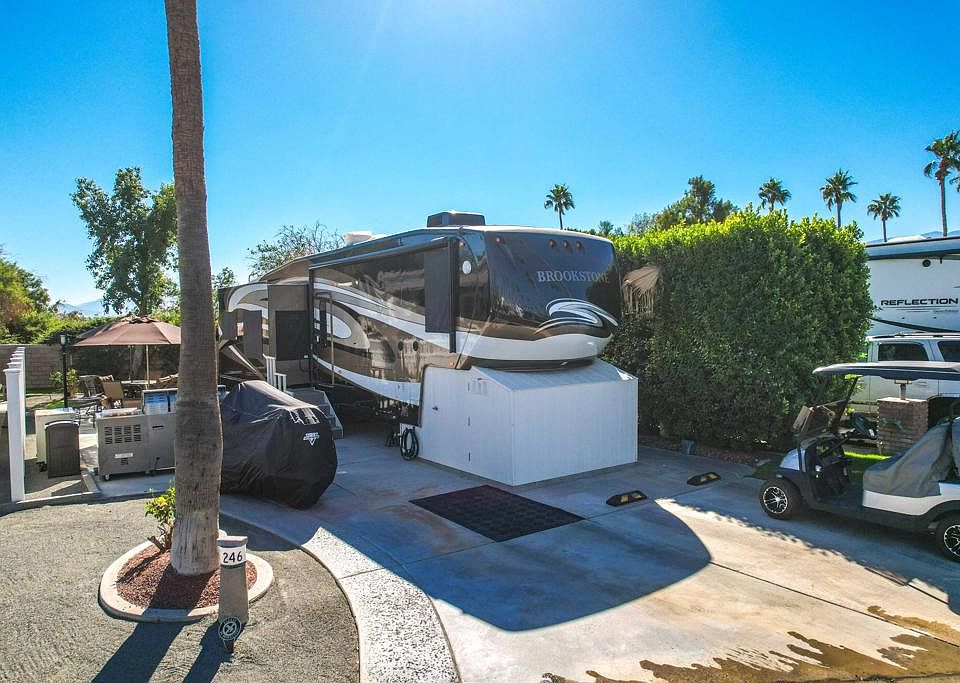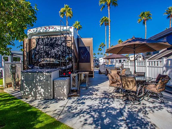 Presenting a captivating vacant lot, skillfully remodeled and expanded to maximize its potential. This exceptional package is complete with a 2010 Forest River Brookstone 5th wheel, featuring convenient steps and a storage shed. Your outdoor haven includes a top-tier Jenn-Air BBQ system with an oven and side burners, making al fresco dining a breeze. Revel in outdoor gatherings with two patio dining tables accompanied by comfortable chairs. Stay cozy during cool evenings with a heater, and keep your outdoor essentials neatly stored in a deck box. Nestled in a fantastic location, this is the ultimate opportunity for outdoor enthusiasts and those seeking a slice of paradise. Outdoor Resorts Palm Springs is a Five Star RV Resort Community combining luxury with affordability. It is a guard gated resort that sits on 137 beautifully landscaped acres with 27 holes of executive golf, 10 tennis courts, 13 pickleball courts, 8 swimming pools, a fully equipped fitness center, beauty salon/barber shop, full-service restaurant, convenience store, 2 club houses, activities, special events and so much more.