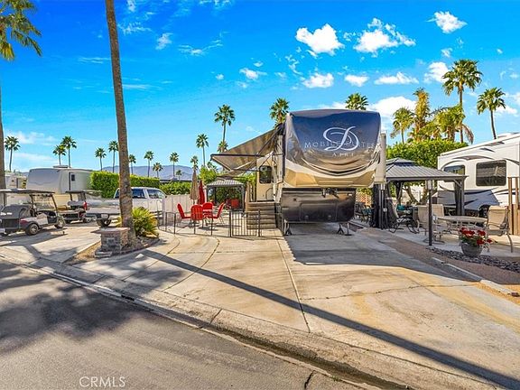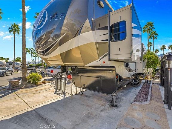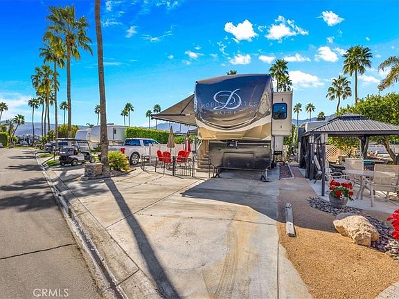 Beautifully expanded Lot 303 is located on the east side of Outdoor Resorts Palm Springs an All-Ages Active Resort Community. The lot features a newly constructed gazebo with electricity, curtain surround for privacy, tv mount and TV, a firepit table with 4 chairs and cushions, vinyl fencing on both sides and a 2018 DRV Mobile Suite Aire M-38, 39'11" in length, with custom wood steps w/storage & wood railing, soft side covers for lower part of fifth wheel. Interior Fifth Wheel Features Include: Corian countertops, center island, stainless steel farmhouse sink, 3 burner Furrion stove, convection microwave, molded tile backsplash with Jute edging, residential fridge/freezer with ice maker, pendant lights over the island, pantry, vinyl wood look flooring expandable wood table for 4, rear living room with 3 recliners, ceiling fan in living room, large windows let in the natural light, sleep number king size bed, 8 drawer dresser, 3 additional storage cabinets, Corian countertops in the bathroom with dual sink vanity, residential toilet, large shower area, stacked Splendide washer/dryer, large closet and plenty of storage space. Outdoor Resorts Palm Springs spans 137 beautifully landscaped acres and offers an unmatched resort lifestyle with 27 holes of executive golf, 10 tennis courts, 13 pickleball courts, 8 swimming pools, a fully equipped fitness center, sports bar (19th Hole), on-site salon/barber shop, café, and two clubhouses with year-round activities, events, and entertainment. Whether you’re seeking an active social scene or a peaceful desert retreat, this is more than a lot—it’s a lifestyle.