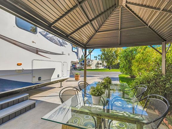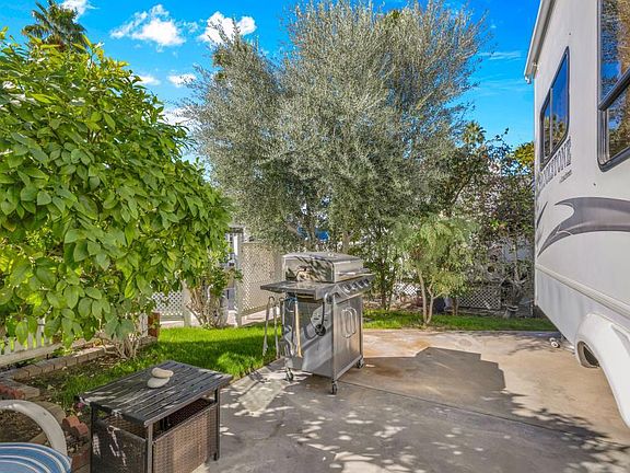 This delightful resort property truly presents a fantastic opportunity. It's perfectly situated on a charming, quiet street, offering a tucked-away feel that's both private and peaceful. Walking distance to La Palma Clubhouse, placing all its amenities and social activities just moments away. Close proximity to the resort's main entrance ensures exceptionally smooth and convenient access for all your comings and goings. One side of the lot features a white fencing providing a lovely backdrop and potential for climbing vines. The mature landscaping is beautifully contained within sturdy brick planters, offering a wonderful selection of trees including an olive tree, alongside three citrus trees - a grapefruit, an orange, and a lime . Adding a splash of color and delightful fragrance, three flowering trees complete this property. This outdoor space comes fully equipped for relaxation and entertaining. An aluminum gazebo is already in place, offering both fabric shades for sun protection and integrated screens for comfortable, bug-free enjoyment throughout the day and evening. Adjacent to this inviting space, a dining table with four chairs awaits al fresco meals and gatherings. A high-quality 4-burner gas grill is included, perfect for preparing delicious outdoor meals. To help maintain a tidy and organized space, two convenient storage boxes are provided, ideal for cushions or outdoor essentials. Lastly, three charming terracotta flower pots are ready for your personal touch, whether with vibrant seasonal blooms or fragrant herbs.