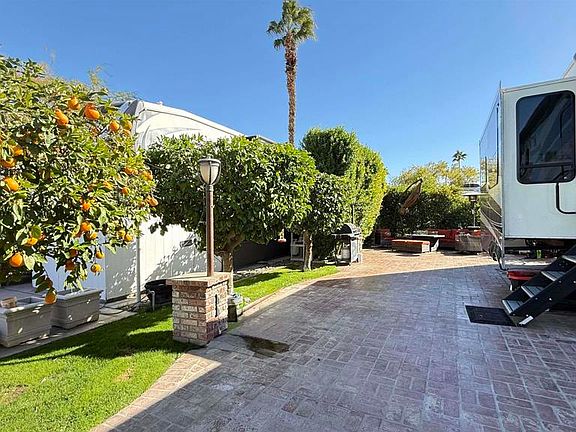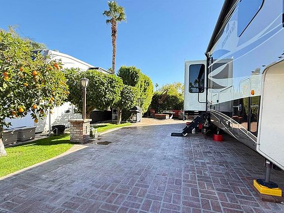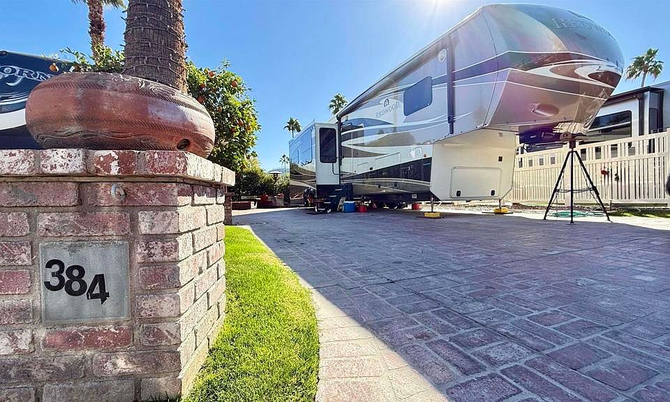 Lot 384, Located in a closely knit and vibrant neighborhood, you’ll be welcomed to this private lot across from satellite with pool, jacuzzi and laundry facilities. Paved in used brick with high hedges and lovely seating area. Outdoor Resort Palm Springs (ORPS) is a Guard Gated 5-Star RV Resort Community offering an active and luxurious lifestyle featuring golf (27 holes), tennis, pickleball, swimming and more! Two clubhouses, fitness center, beauty solan, La Roma Restaurant on campus, dog park and more!