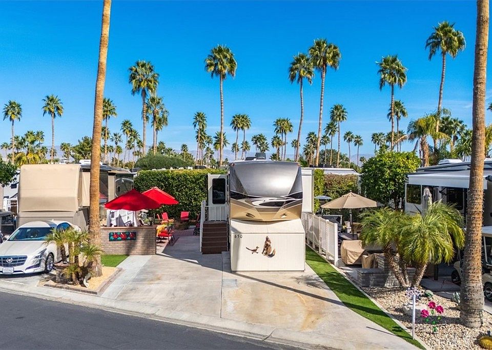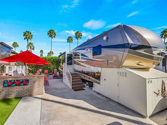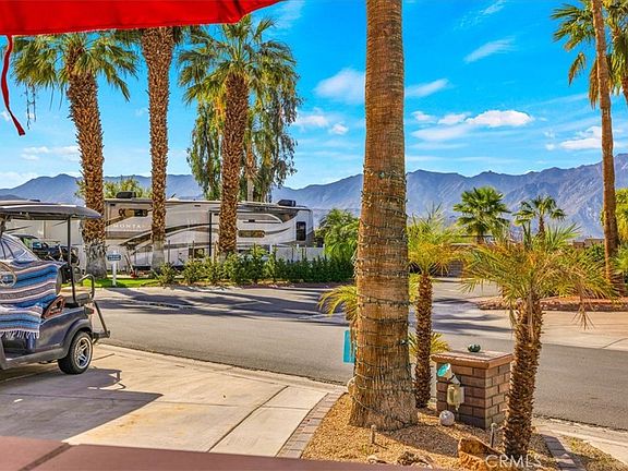 Beautifully upgraded east-facing lot on desirable Ficus Drive with unobstructed views of the San Jacinto Mountains in the guard-gated Outdoor Resorts Palm Springs Community. This turnkey outdoor living space features vinyl fencing, custom downlighting, a front privacy wall, low-maintenance astro turf, and expanded concrete in the rear—maximizing patio and entertaining areas. Included in the sale are all outdoor patio furniture, area rugs, storage box, a 2012 Redwood Fifth Wheel M-36RL with lots of natural light, front doghouse, and custom stairs with wood railing. A short walk to the dog park, Satellites D and E and the El Saguaro Club House with Pickleball Courts and Owners Lounge. Lot 650 is on the west side of the resort in the highly sought-after neighborhood locals call “WEHO.” Outdoor Resorts Palm Springs spans 137 beautifully landscaped acres and offers an unmatched resort lifestyle with 27 holes of executive golf, 10 tennis courts, 13 pickleball courts, 8 swimming pools, a fully equipped fitness center, sports bar (19th Hole), on-site salon/barber shop, café, and two clubhouses with year-round activities, events, and entertainment. Whether you’re seeking an active social scene or a peaceful desert retreat, this is more than a lot—it’s a lifestyle.