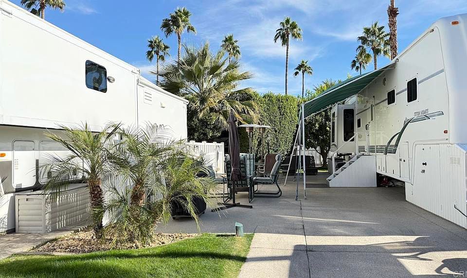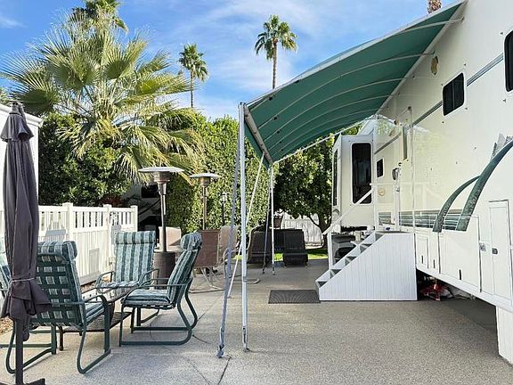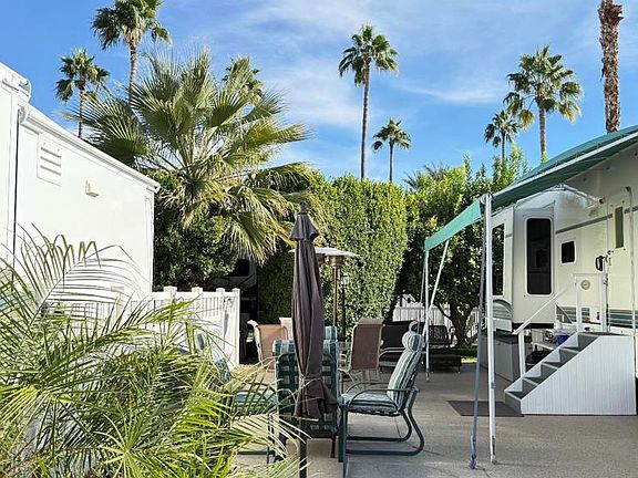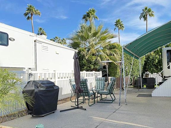 Lot 720, Fantastic westerly Mountain Views! Cement has the speckled surface with patio privacy and fencing. Very close to El Saguaro clubhouse so you’re minutes from all activities. Included is a Club Car golf cart and patio furniture. RV will be leaving the resort. Outdoor Resort Palm Springs (ORPS) is a Guard Gated 5-Star RV Resort Community offering an active and luxurious lifestyle featuring golf (27 holes), tennis, pickleball, swimming and more! Two clubhouses, fitness center, beauty solan, La Roma Restaurant on campus, dog park and more!