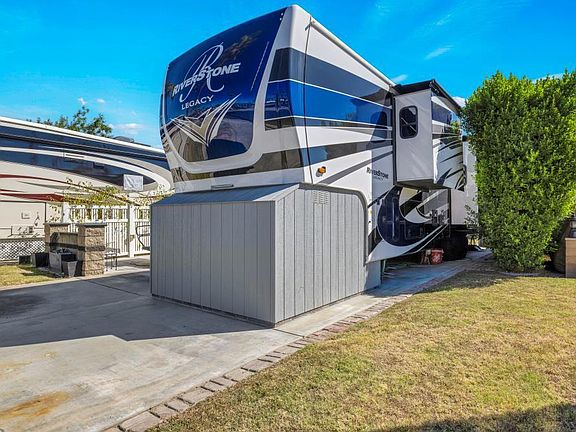 NEW LISTING LOT 909 This exceptional offering includes a luxurious 2023 Riverstone Legacy fifth-wheel RV, meticulously designed for comfort and convenience. The 45-foot gently used unit features a gourmet kitchen, master and half baths, a contemporary white interior, integrated washer/dryer, handy desk area. Strategically located, Lot 909 provides picturesque partial mountain views from the front, facing the golf course's back 18. Unobstructed Mountain views unfold from the rear, nice size green space behind lot. Complementing this, an updated patio and a golf cart are also part of the package.I anticipate strong interest in this unique property as this location is very popular. Please contact me for further information or to schedule a viewing.