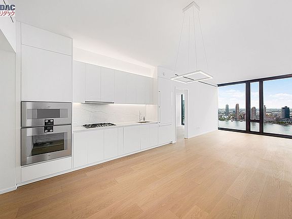 This spacious one-bedroom, one-bath residence offers breathtaking views of the East River through floor-to-ceiling windows, creating a bright and airy atmosphere. The ceiling height of over nine feet enhances the sense of openness,