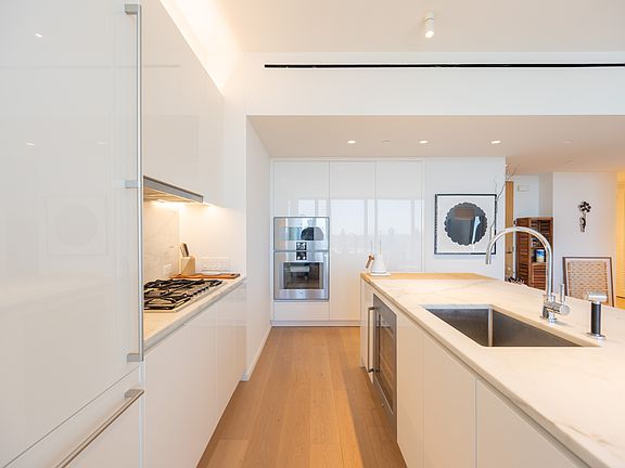 The chef's kitchen features Gaggenau appliances, Italian white lacquer cabinetry, and Calacatta Lincoln marble countertops. The expansive bedroom suite includes a walk-in closet and a spa-like marble bathroom, complemented by a stylish powder room for guests. Enhancing daily living, the home is equipped with a smart system for seamless control of motorized shades, lighting, and climate.