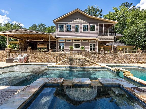 This exceptional lakefront estate offers resort-style living with amenities thoughtfully designed for both relaxation and entertaining. Privately gated and nestled on 3.34 acres of beautifully landscaped grounds, the home showcases over 7,000 square feet of refined living space with 10,855 under roof, featuring 5 bedrooms and 7 full bathrooms. Step outside to your own private retreat, complete with a saltwater gunite pool and jacuzzi, tennis/pickleball courts, and a spacious pavilion with a stone fireplace—perfect for hosting family and friends. Meandering walking trails, stone waterfalls, and multiple outdoor gathering areas enhance the tranquil lakefront setting. Inside, the great room impresses with cathedral-beamed ceilings, rich hardwood floors, and a stunning stone fireplace. The gourmet kitchen on the main level features a large island, high-end finishes, and ample space for entertaining. The luxurious primary suite offers custom built-ins and opens to a private screened porch with its own fireplace and hot tub. The en suite bath includes a soaking tub and a beautifully tiled walk-in shower. Designed for flexibility and ideal for large or multi-generational families, the home offers multiple living areas, three full kitchens, two bonus rooms, a loft, and two laundry rooms. Additional highlights include an RV garage, a detached two-car garage with extra storage, and a double boathouse with floating dock and seawall. This is a rare opportunity to own a one-of-a-kind lakefront estate blending privacy, space, and lifestyle in one extraordinary property.