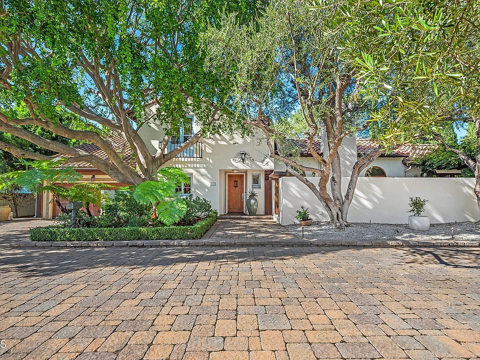 Located in the lovely Huntington Library Estate area of Pasadena on gracious Holladay Road, this special Mediterranean Revival residence was originally designed in 1929 by Roland Coate and has been enlarged and extensively updated by the current owners. The exceptional floor plan begins with an attractive foyer opening to the grand living room with beamed cathedral ceiling and handsome fireplace. Perfect for entertaining, the living room features French doors to a charming walled patio with fountain and arbor on the street side and on the other side an arch to a splendid gourmet kitchen / family room with sky lights and French doors to a back terrace that overlooks the pool, spa, fireplace and gardens. Beyond the living room is an elegant formal dining room. The luxurious primary bedroom suite is on the main level with fireplace and French Doors to the back garden and pool; a large primary closet with custom built-ins, a gorgeous bath with steam shower, spa tub, private commode and a stylish antique Pullman complete the sensual spa environment. A powder guest bath, a library / office with custom built-ins off the entry and a laundry and maid's room and bath off the kitchen complete the first floor. Upstairs are four additional bedrooms and three baths; one of those with a balcony overlooking the back garden could be a second or alternate primary bedroom. These upstairs bedrooms all open onto a delightful upstairs sitting / family room. Features include: hardwood and travertine flooring, HVAC, security system, two car attached garage, spacious, large level lot and mature Thomas Church designed landscaping. With privacy and serenity, this wonderful property has it all.