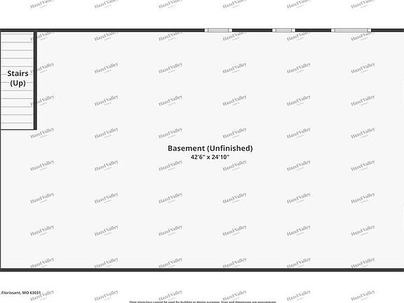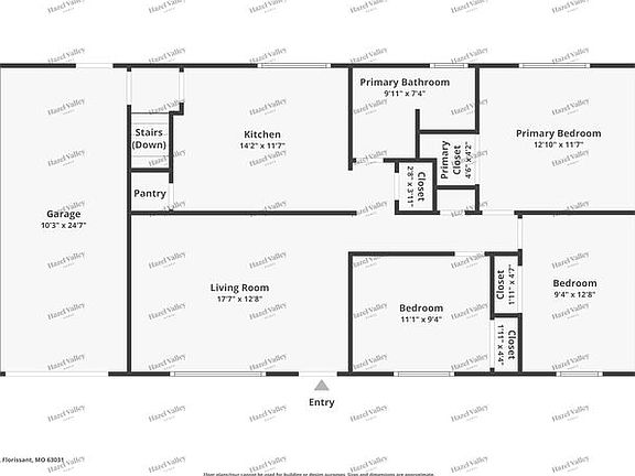 This single-story 3-bedroom, 1-bathroom home in Florissant, Missouri offers approximately 1,025 square feet of interior living space. The exterior includes a driveway leading to an attached garage and a front yard with established planting areas. The rear of the property features an open lawn.