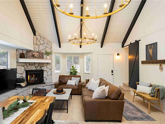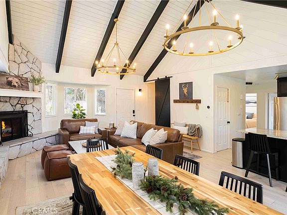 Welcome to 695 Sutter Lane, a beautifully updated single-family residence tucked away in the desirable Arrowhead Woods community of Lake Arrowhead. This 3-bedroom, 2-bathroom chalet offers 1,540 square feet of comfortable living space on a generous 9,350 square foot lot. Recently refreshed with thoughtful updates, the home blends modern convenience with classic mountain charm. The main level features an open-concept layout with a warm and inviting living room centered around a stone fireplace, perfect for cozy evenings. The updated kitchen flows seamlessly into the dining area, making it an ideal space for entertaining and family gatherings. Two guest bedrooms and a full bathroom complete the main floor, while the upstairs is dedicated to a private master suite with its own ensuite bath.