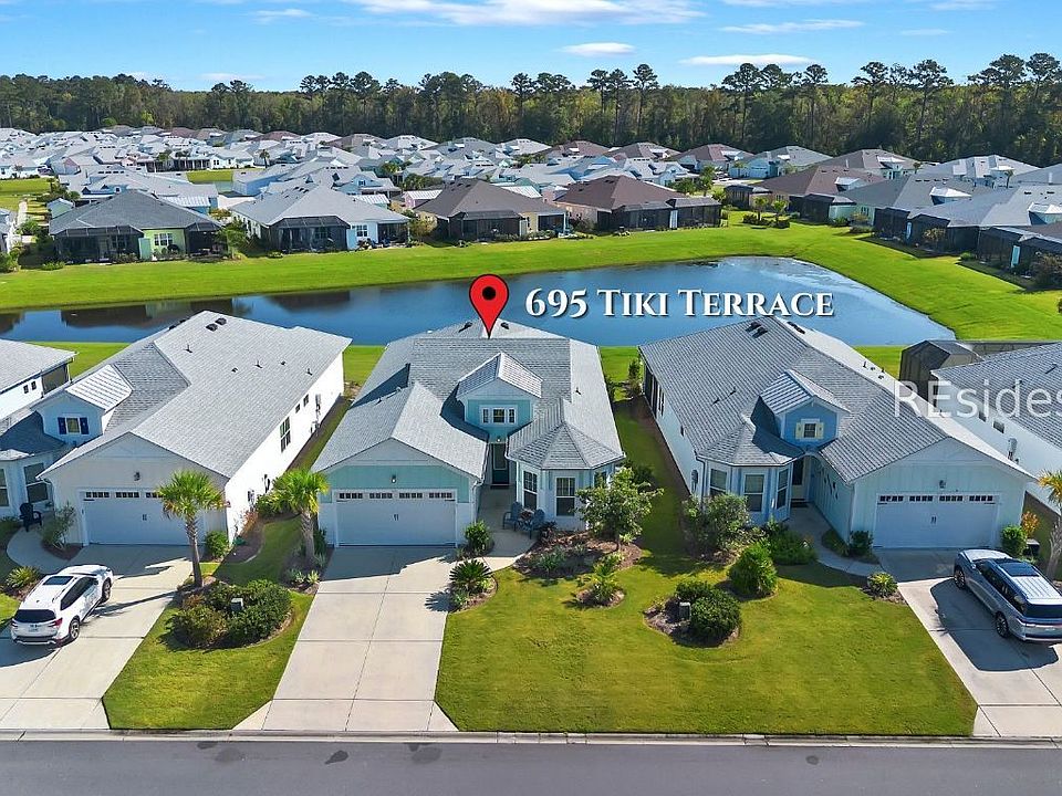 Welcome to 695 Tiki Terrace, a beautifully appointed three-bedroom retreat filled with custom designer upgrades. This home offers an ideal blend of elegance and functionality, perfect for modern living. The den is highlighted by a full wet bar - ideal for entertaining - while a built-in desk, wall-to-wall closets, and a Murphy bed add everyday convenience. Two bedrooms feature en-suite baths, including a spacious primary suite with private patio access. The chef's kitchen showcases stunning granite counters and distinctive gold accents, opening seamlessly to the living and dining areas. Enjoy indoor-outdoor living with expansive sliders leading to a screened lanai and extended patio, perfect for relaxing or entertaining. Some furnishings are available on a separate bill of sale, making this home move-in ready.