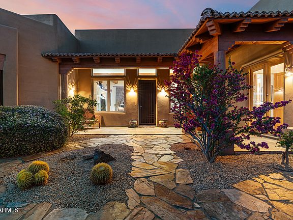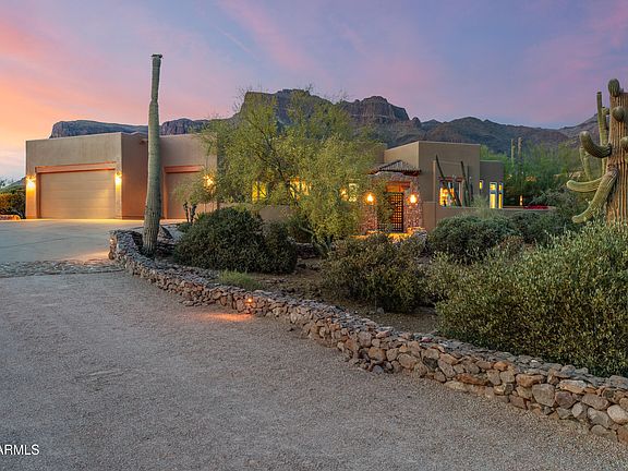 Spectacular custom on stunning VIEW acreage backing Tonto National Forest! This 3,548 SF single level 3 bdrm + den, 3.5 bath home truly has it all. Unobstructed Superstition Mtn VIEWS + city lights from the spacious private resort backyard featuring sparkling pool, waterfall, spa, outdoor kitchen w/built-in BBQ, covered patios & walkway to observation VIEW deck. Oversized private gated courtyard beacons to luxury living & unsurpassed VIEWS. Greatroom boasts beamed ceiling, floor to ceiling propane fireplace & Superstition Mtn VIEWS. Gourmet kitchen features fabulous custom cabinetry including glass display doors, big bar island, granite counters, stainless appliances, double ovens, large walk-in pantry & Superstition Mtn VIEWS. Primary suite sports lovely luxury bath w/jetted tub, walk-in shower, huge walk-in closet, kiva fireplace, huge sitting area, private pool access & Superstition Mtn VIEWS. Private & spacious guest suite includes large sitting area, bath & private pool access. Soaring ceilings & slate flooring T/O. 2024 roof, 2024 Interior & exterior paint. Extended 3 car garage. Rare VIEW lot location in exclusive Superstition Highlands.