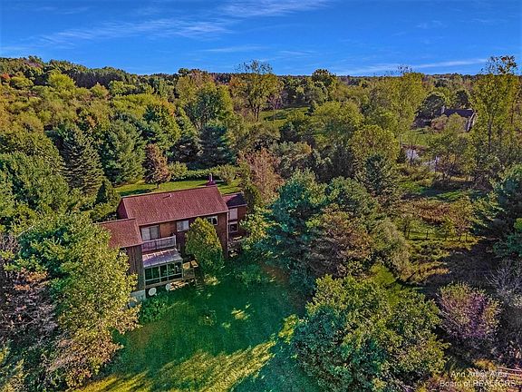 All the comforts of a contemporary home surrounded by breathtaking natural beauty on 10 acres bordering Waterloo State Recreation Area yet only minutes from downtown Chelsea! This 3-bed/3.5-bath home has large windows and decks overlooking the woods and the open fields down to the headwaters of Mill Creek. There is also a pond on the south side of the property shared with the neighbors. The home has a brand-new furnace and AC, a seasonal, glassed-in porch, two basements, a 2-car garage, and a large pole barn. The home also features two wood-burning fireplaces including one in the stone-tiled corner of the spacious Great Room, with its south-facing windows, a full-bathroom, and a loft, giving the room an airy "Up North'' feel. The second basement, below the Great Room, features open storage and a 14'X14' reinforced storm shelter with a wide variety of uses. Newer washer and dryer are on the first floor.