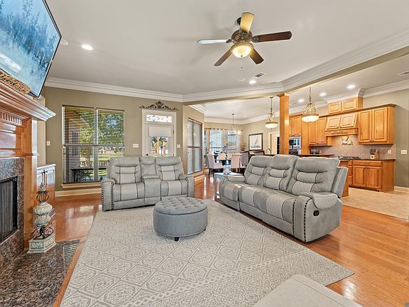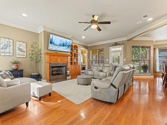 Welcome to this stunning two-story home that perfectly blends elegance and comfort. The open-concept living area features beautiful wood flooring, soaring ceilings, a cozy fireplace with built-ins, and large windows that fill the space with natural light while offering tranquil lake views. The kitchen offers warm wood cabinetry, granite countertops, stainless steel appliances, a gas cooktop, wall oven, built-in microwave, and an inviting dining area that flows seamlessly for everyday living and entertaining. The main level also features a spacious primary suite with dual vanities, a jetted tub, separate shower, water closet, and a large walk-in closet with double hanging and shelves. Additionally, there is a second bedroom and a full bathroom on the first floor, providing flexibility for guests. Upstairs, you will find a versatile study or common area, along with two additional bedrooms and a full bathroom. Step outside to enjoy the covered patio and charming gazebo, perfect for entertaining or relaxing while overlooking the fully stocked lake. The Audubon Lakes community enhances your lifestyle with exceptional amenities, including two scenic lakes, a pool, and a covered pavilion with a play area that is available for residents to reserve for private gatherings.