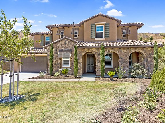 Welcome home to Ridgemark Court in Moorpark California! A beautifully appointed newer construction 5 bedroom home with over 3700 square feet of living space in a gate guarded community privately located at the end of a cul de sac and backs to open space! Arched stone front porch leads to the grand foyer with a formal living room and fireplace. There is an adjacent formal dining room with a ceiling fan. The great room floor plan includes a family room, gourmet kitchen and breakfast area. The family room has a ceiling fan, built in cabinets, shutters and ceiling speakers. The kitchen features a huge center island, stainless appliances and farm sink, built-in microwave and refrigerator. There is no carpet in this home. The first floor has a full bedroom suite with ceiling fan, shutters and a full bathroom. There is also a half bath powder room. Upstairs, an oversized bonus room has room to accommodate multiple uses. The primary bedroom looks out to the open space behind the home with coffered ceiling and ceiling fan. The primary bathroom has two walk-in closets, a soaking tub and an extra large shower. Two bedrooms share a full bathroom and an additional bedroom suite has its own bath. Outside, a large California room has a fire pit, fountain and large ceiling fan. Complete privacy with the home backing to open space. This pie-shaped lot comes from the rare location at the end of a cul de sac with extra large side yards that makes this one of the larger lots in the community. Gate guarded community has play area, basketball, tennis and community pool.