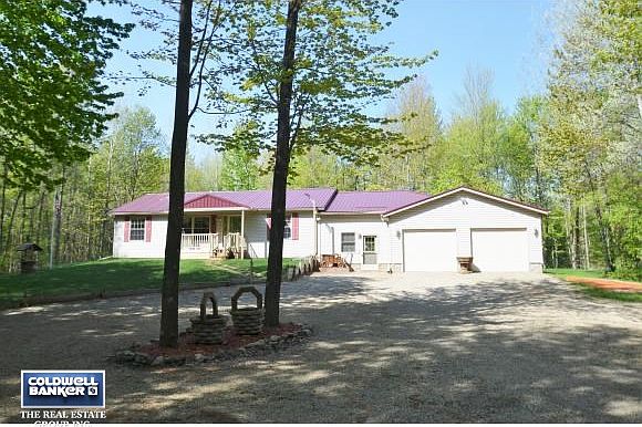 Private retreat on beautiful wooded acreage. Large living room with all new bamboo wood floors. Master bath was torn down to studs and is now spacious with a new jetted tub, new vanity with granite countertop, new toilet and floors. Open concept kitchen with patio sliders to deck. Breeze-way between home and garage is insulated and currently used as exercise room. Basement entry from breezeway. 24x36 garage with front and rear entry. Steel roof on house and attached garage. Cul-de-sac road.