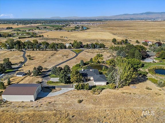 Enjoy breathtaking views of the Boise Valley from this rare 4.97-acre estate property, ideally located in an exclusive subdivision bordering the Birds of Prey conservation area. This custom-built home offers exceptional space and flexibility for generational living, with two full levels—each featuring its own kitchen. Quality finishes include mahogany wood floors, energy-efficient Pella windows, and fresh interior paint throughout. A brand-new roof adds peace of mind and long-term value. The main-level master suite showcases expansive valley views and a private ensuite bath, while the wraparound deck provides the perfect setting to take in the panoramic scenery and wildlife. Additional features include a large pond, dedicated workout/bonus room (not included in square footage), two separate two-car garages (one on each level), and a massive 40x60 insulated shop with RV doors and 220 power. A unique opportunity offering space, privacy and versatility just minutes from town!