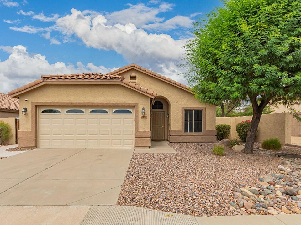 Come see this charming 3-bedroom home perfectly located near Arrowhead! Ideal for those seeking low-maintenance and comfortable living, this gem features a spacious layout perfect for relaxation and entertaining, showcasing tile flooring in all the right places, arched passageways, vaulted ceilings, and neutral tones. The well-appointed kitchen boasts oak cabinetry, upgraded countertops, built-in appliances, fridge included, dining area, and a pass-through window. The spacious primary bedroom is a true retreat complete with a walk-in closet. The backyard hosts a cozy covered patio with flagstone flooring perfect for morning coffee and weekend grills, and a soothing low maintenance landscape with artifical grass perfect for kids and dogs and shade trees. Welcome Home!