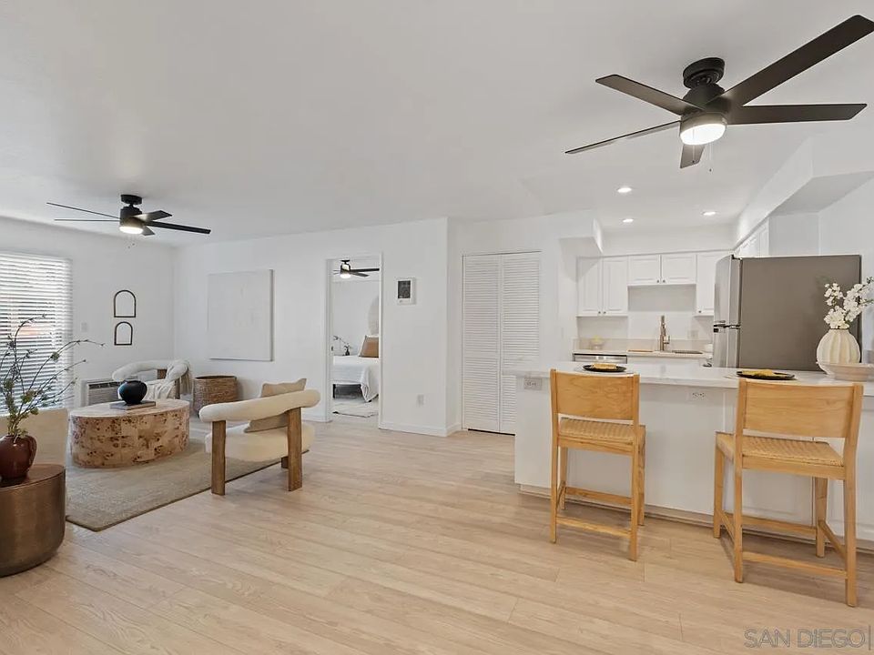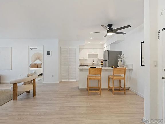 Welcome to Cerro Vista! This beautifully remodeled ground-level condo in the sought-after Del Cerro/College area offers modern upgrades and an unbeatable location. Featuring 2 bedrooms and 2 bathrooms, this home has been fully updated with brand-new stainless steel appliances, luxury vinyl plank (LVP) flooring, fresh paint throughout, recessed lighting, new light fixtures and ceiling fans, and brand-new blinds. The kitchen has been completely renovated, making it the perfect space for cooking and entertaining. The open floor plan flows seamlessly to your private balcony, ideal for relaxing or enjoying your morning coffee. The spacious primary suite offers dual closets, while the guest bedroom includes a walk-in closet for ample storage. Additional highlights include in-unit stackable laundry, AC, and heating. Assigned parking is included. Cerro Vista provides fantastic community amenities including a sparkling pool and a recreation center available for private events. Just steps away from the famous DZ Akins Deli and within minutes of trolley stops, freeways, shops, and restaurants, this condo is perfectly situated for convenience and lifestyle. Whether you’re a first-time buyer or looking for a great investment, this move-in-ready home has it all!