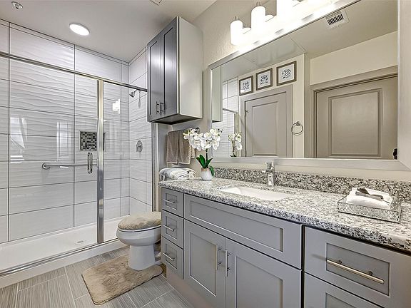 Modern light fixturesModern under mount lavatoriesDesigner carpetGranite countersLuxury wood-style flooringStainless single bowl sinkGlass shower enclosure