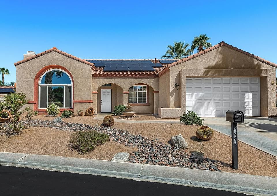 Nestled on a quiet cul-de-sac in the desirable Rio Del Sol neighborhood of Cathedral City, this charming 3-bedroom, 2-bathroom single family home epitomizes desert resort living. Conveniently close to Aqua Caliente Casino, In-Shape Fitness, Trader Joe's and other casual restaurants, shops and grocery stores, Rio Del Sol is centrally located between Palm Springs and Palm Desert which allows residents to enjoy everything the Coachella Valley has to offer. The bright, open concept interior welcomes you with vaulted ceilings and lots of windows (5 brand new) with custom window shades and a cozy living room fireplace. The spacious kitchen with quartz counters, neutral wood cabinets and bar seating faces the private backyard pool area through floor to ceiling glass doors and clerestory windows. Relax on the poolside sundeck and soak in the majestic western mountain views and warm desert sunshine. The primary bedroom also has direct access to the backyard / pool and includes an ensuite bath with dual sinks, soaking tub and large walk-in closet. Newer appliances include HVAC, washer, dryer, garage door opener and a newer refrigerator. This home also features a 2-car garage, leased solar, indoor laundry/mudroom and well-kept low maintenance desert landscaping. Many Rio del Sol amenities for residents to enjoy include a swimming pool, spa, clubhouse, tennis courts, dog park and community lake. HOA includes: Spectrum cable, weekly disposal pick-up, daytime guard gate and maintenance of common grounds. 30-day rentals are allowed. Move-in ready and furnished, this home is perfect for a full-time residence or a vacation retreat. Schedule a tour today!