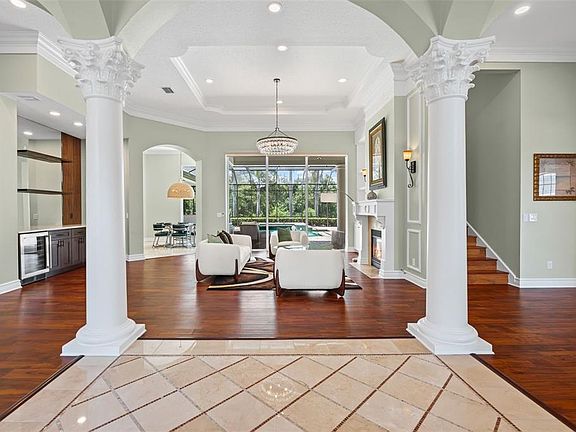 Welcome to Maison du Lac, an exquisite and timeless-designed residence nestled in the premier community of Lakewood Ranch Country Club. This location offers not only spacious and private lots but also the enchanting backdrop of a serene lake, complemented with a stunning saltwater pool & hot tub —perfect for relaxation and entertaining. As it is among the first communities in Lakewood Ranch - the HOA is with Town Hall and only $150/month. And the electricity is inside the hospital grid and has never gone out! Many upgrades - including a new tile roof and super systems make for easy living. As you approach the home, you are greeted by a long tear-drop driveway framed by elegant columns bearing the name "Maison du Lac." This leads you into a circular driveway that provides easy access to the impressive entryway and around to the three-car garage. Upon entering, you are welcomed by a grand foyer that opens into the expansive Great Room, where natural light floods in, showcasing views of the pool and picturesque pond. To your right, the inviting piano room adds a touch of sophistication, while to your left, the formal dining room awaits—ideal for hosting gatherings. The heart of the home is the Chef's Kitchen, equipped with top-of-the-line Thermador appliances, a reverse osmosis water system, a built-in coffee maker, and a convenient pot filler over the gas range. The kitchen also features a large eat-in breakfast area and a dedicated kitchen office for culinary enthusiasts. The family room is designed for entertainment, boasting an impressive 85" screen TV and adjacent bonus room, perfect for movie nights or game days. This wing of the home includes two additional bedrooms and a full bathroom, ensuring ample space for family and guests. Retreat to the luxurious Master Suite, which offers direct access to the pool and lake, creating a tranquil oasis. This suite features his and hers walk-in closets, as well as a lavish bathroom complete with both a soaking tub and a spacious shower, along with separate toilet rooms for convenience. But the allure of Maison du Lac doesn't end here. Ascend to the upper level, where you'll find a captivating balcony that provides sweeping views of the surrounding landscape. This level also includes a game table, a full bath, and a bar area—perfect for entertaining or unwinding in style. Live like royalty in this magnificent home, where every detail has been thoughtfully designed for luxury and comfort. Welcome to your dream home at Maison du Lac!