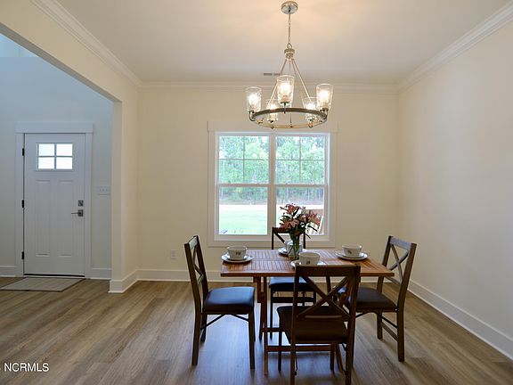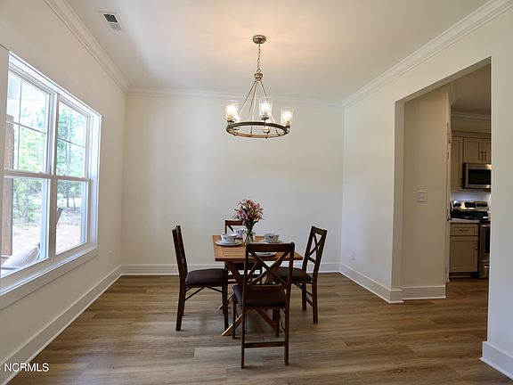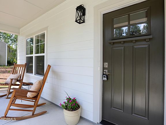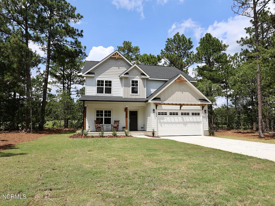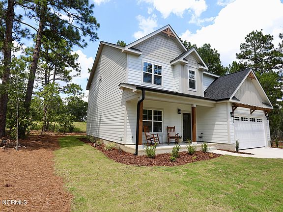 call listing agent for details! Welcome home to this stunning new build by Wolf Development and Construction! Greeted with a covered rocking chair front porch, you enter into an open floor plan that flows into the dinning room, kitchen, and living room. This gorgeous kitchen is filled with an abundance of light and has Champagne Gold finishes, quartz counters, spacious bar, tiled backsplash and a walk in pantry. There is lots of room to invite family and friends over to enjoy brunch/dinner in the formal dining room. The light filled living room has a gas fireplace and overlooks the Palmer Golf course. Step outside to relax on the covered patio and enjoy the lovely outdoors! Luxury vinyl plank and crown molding is throughout the main living spaces. There is a drop zone near the laundry room. The primary bedroom is downstairs, has 2 closets, and large windows with beautiful views. The ensuite has tiled flooring, quartz counters, double vanity, tiled shower, water closet, and garden tub. This home boasts 2,616 sq ft of living space with 5 bedrooms and 3 1/2 baths plus a large bonus/flex room. Space galore! Bald Eagle is a quiet street with a cul-de-sac at both ends. Nestled in the desirable gated community of Woodlake, you will find unique amenities. Relax by the pool this summer and enjoy refreshments from the snack shack. The kids will never be bored with the playground, basketball and volleyball courts. . Woodlake is near Fort Bragg, Pinehurst, Southern Pines, Sanford and medical facilities. This exquisite home can be yours today!! Builder is offering tremendous incentives so call listing agent for details! Photos are representative only. Paint and cabinet colors can vary from pictures.