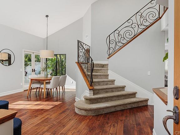 Welcome to your peaceful, private retreat in the heart of Encinitas. Tucked away on a breezy greenbelt in gated Poinsettia Park, this charming pool home is your place to live the quintessential North County lifestyle. Year-round indoor/outdoor living with your own resort-style pool and spa, & a stunning home with a flowing, open layout. High ceilings and rich wood flooring greet you at entry with a skylight spilling natural light onto a curving central staircase. The home boasts a prized downstairs bedroom with adjacent full bath. A large living room flows into the updated kitchen & adjoining family room with a fireplace. Then step out to your stunning backyard oasis. A newly re-finished pool & concrete patio, surrounded by lush landscaping—the perfect backdrop for entertaining & quality time. Upstairs, the spacious primary bedroom features an en suite bath with a steam shower. A walk-in closet. Two additional bedrooms and one full bath are also upstairs. Attached 2-car garage. Community walking trails. Meticulous homeowner maintenance and extensive upgrades. Less than 2 miles to beaches & downtown Encinitas, top-rated schools, Leucadia Farmers market, close to everything.