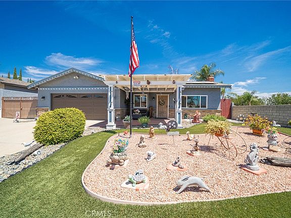 Beautifully remodeled single-story home on a quiet cul-de-sac with mountain views! This 3 bed, 2 bath home features a gourmet kitchen with a huge island, stainless steel appliances, walk-in pantry, and updated finishes. The family room has a custom entertainment center and cozy fireplace, perfect for gatherings. Bedrooms feature wood laminate flooring and dual-paned windows, with updated bathrooms throughout. Outside, enjoy low-maintenance turf, stone siding, new garage door and opener, RV gate, brick mailbox, and new paving stones at the entry. The backyard is an entertainer’s dream with turf, lighting, two large sheds, and a spacious patio. Major upgrades include a brand-new 4-ton A/C unit, rebuilt furnace, smart thermostat, solar panels, and newer water heater. Conveniently close to schools, parks, shopping, and Victoria Gardens—this home is truly move-in ready!