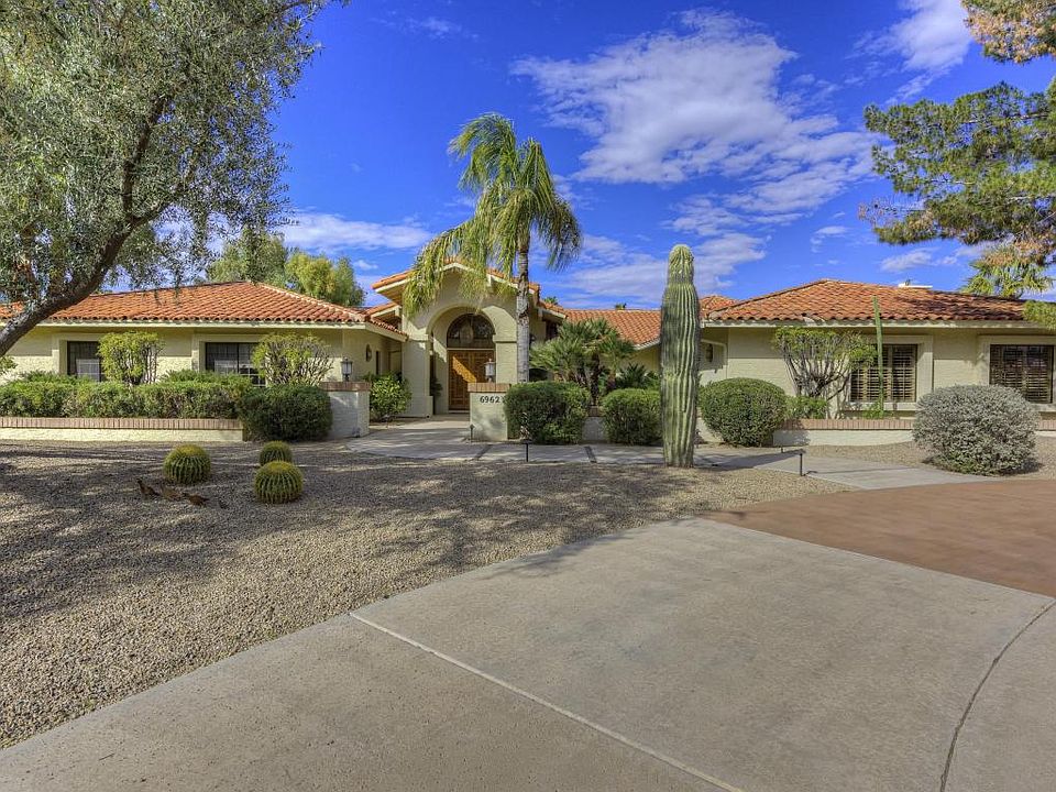 A gem nestled in one of the best locations in Paradise Valley. Surrounded by $2 million plus homes, 4200 sq. ft. and 44,000 sq. ft. lot, this home is ready to be taken to the next level. 4 bedrooms/3.5 bathrooms, spacious family room with fireplace, wet bar, breakfast room and renovated kitchen overlook pool, spa, water feature. Formal living room and dining room feature palladium windows and Sliding doors allowing access to covered patio. En-suite guest bedroom plus 2 other guest bedrooms feature walk-in closets. Guest bathrooms renovated with large walk-in showers. Master suite boosts a fireplace, spacious master bath with separate shower/toilet room, large whirlpool tub, dual vanities, walk-in closet. Backyard Ramada with BBQ and Kiva Fireplace. A golfer's paradise awaits. Over sized putting green provides the golfers of the family plenty of practice. Ample room for a guest house to be built. Seller has plans available for a 1200 sq, ft, 2 bedroom guest house. The 3 car garage with work room complete the home.