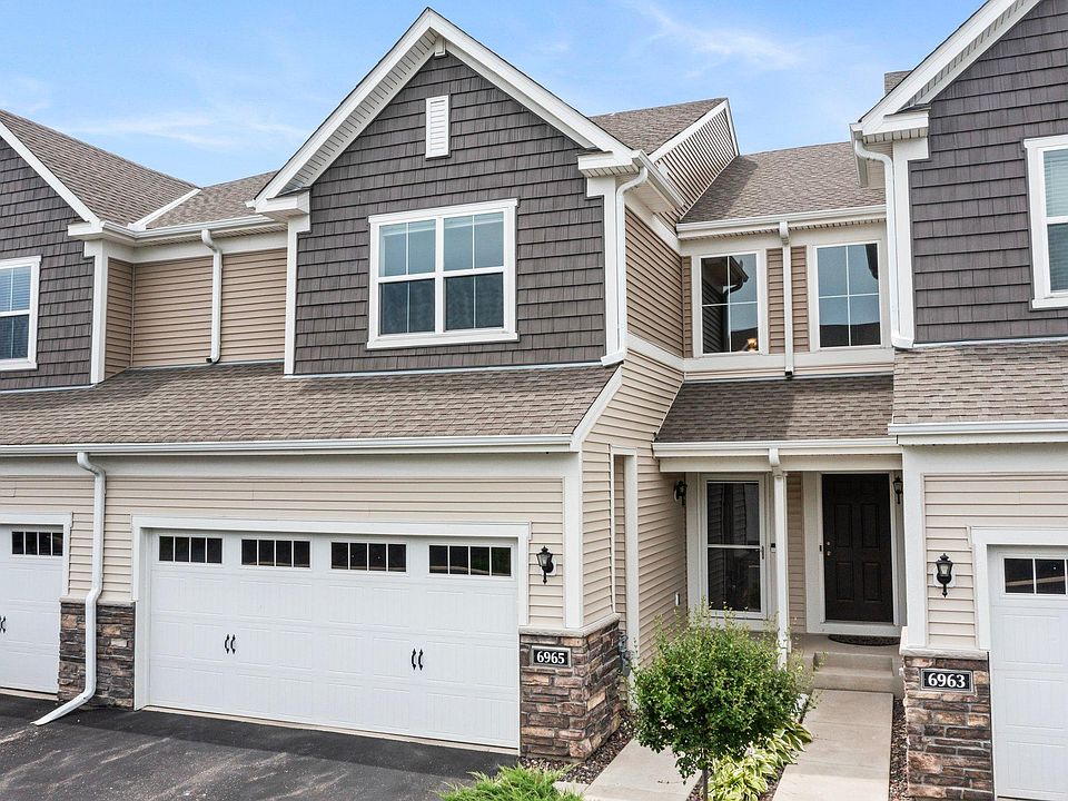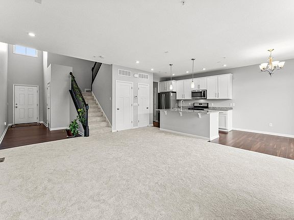 Presenting a stunning vaulted two-story townhome that combines modern elegance with comfort. Upon entering, you are greeted by a spacious family room seamlessly connected to a beautiful kitchen featuring elegant white cabinets, moon white granite countertops, and stainless steel appliances including a gas range and French door fridge. Upgraded with a water softener and osmosis system for drinking water, this home also boasts pre-wiring for a home theater system on the lower level and an enhanced internet-ready system throughout. Upstairs, three bedrooms await, with the expansive primary suite standing out for its ample closet space and privacy. The primary bathroom boasts a double bowl vanity and a spacious walk-in shower. Conveniently located near 494 with easy access to St. Paul and Minneapolis, this home resides in the coveted #196 school district. Brand new carpet and paint on main and upper levels. Welcome home!
