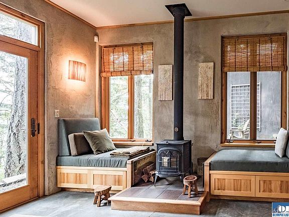 Experience Privacy & Serenity on 4.9 acres of southwest facing waterfront! Retreat from the urban world to a lovely home designed by architect Amy Hiatt. 315 ft waterfront plus share of 25 acres open space with stairs to the beach. This elegant home has all the room you need. Built in cabinetry, wood stove, open & inviting for intimate living. Across the courtyard is a 2nd space with a bath and mini kitchen that could be another bedroom, office or guest house. 2 parcels. Quiet seclusion on the waterfront.