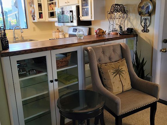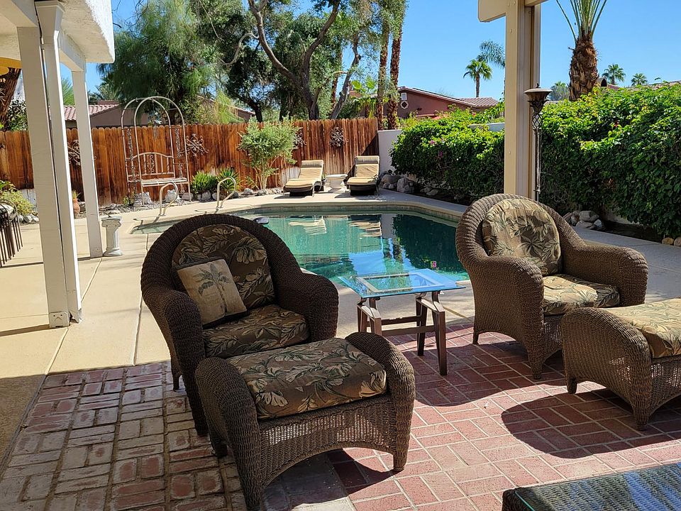 Home is available January 1st. Available for viewing by appointment. Located in a gated complex with attached 2 car garage. This fully furnished one level 2 bedroom 2 full bath detached condominium sits on a private 4791 sf lot. Yes you heard that correctly, your own private fully fenced back yard. The backyard has a nice size private in ground Pebble Tec pool and attached spa. There is Cool Decking around the pool with direct access from the Master bedroom. There is a small grass area with trees including 3 Lemon and 1 Grapefruit. Also there is a nice area at the end of the pool with 2 chaise lounges as well as another seating area off the kitchen with a couch, 2 chairs with ottomans, swing and outdoor dining table. The front of the home has a nice patio with seating as well. The unit is tastefully appointed with a large couch, recliner and a lift top coffee table as well as 2 newer TVs in living room and bedroom. There is also a bar for dining. Popcorn ceilings were removed in 2023 and completely painted inside and also the exterior. All appliances are newer and stainless steel. The gas range is Convection with built in Air Fry option and the refrigerator has in door ice and water. There is a laundry area located in the hall bath with newer LG washer and dryer. Home also has newer hot water tank, heat and a/c. 2 car garage is fully equipped with storage cabinets, a large fully loaded tool bench and extra refrigerator. Pets are negotiable. This property is available for a 1 year + lease or possible short term rental. Please contact for short term rental options as pricing will vary. Fantastic location close to everything with good schools, shopping, restaurants and freeway access. The complex has Tennis courts and 2 shared pools in addition to the private pool in backyard. Welcome home to your private oasis in the sun.