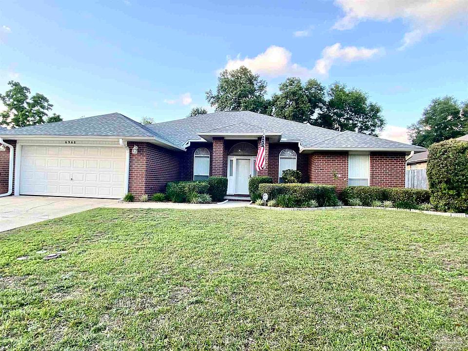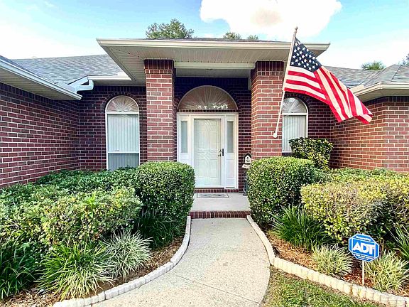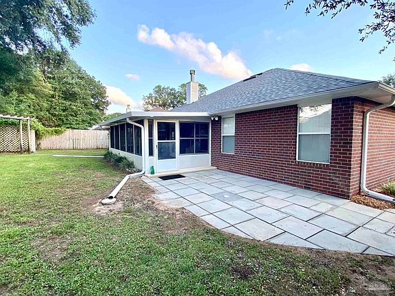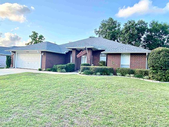 This 4/3 brick home features an open, split floor plan in a well laid out design. A neatly maintained lawn welcomes you to a covered entryway, where a frosted glass front door and transom window allows natural lighting to flow in while maintaining your privacy. Enter this lovely home through to a formal dining/living area. A gas fireplace with tile surround & mantle set beneath a cathedral ceiling creates a beautiful focal point in the great room, while windows along one wall allows more natural lighting in. A breakfast bar overlooks the great room from the kitchen, affording additional seating or a serving station when hosting guests. The eat-in area will accommodate a nice size table, having you equipped for weeknight meals. In the Master suite, you'll find a walk-in closet, double vanity, and garden tub w/separate shower. Two additional bedrooms are opposite the Master and offer ample size closets & a shared hall bath. Along the back of the home is another bedroom and bath that offers privacy that is perfect for a mother-in-law suite or guest quarters. The builder added a screen porch with mylar windows and a hot tub for year around enjoyment. Outside you will find a superbly landscaped lawn with labor saving sprinkler system, privacy fence, and yard building. This is a great house for entertaining with formal and informal areas but still open and flowing floor plan. Buy with peace of mind. NEW ROOF in ’18 and the NEW 3.5 ton HVAC in ’16. The seller purchased an extended warranty that is transferable. There is a transferable termite bond through April 20, 2023. This home is convenient to I-10, the Navy Federal campus, & an abundance of outdoor activities the Gulf Coast has to offer. Call today for a tour of this lovely home!