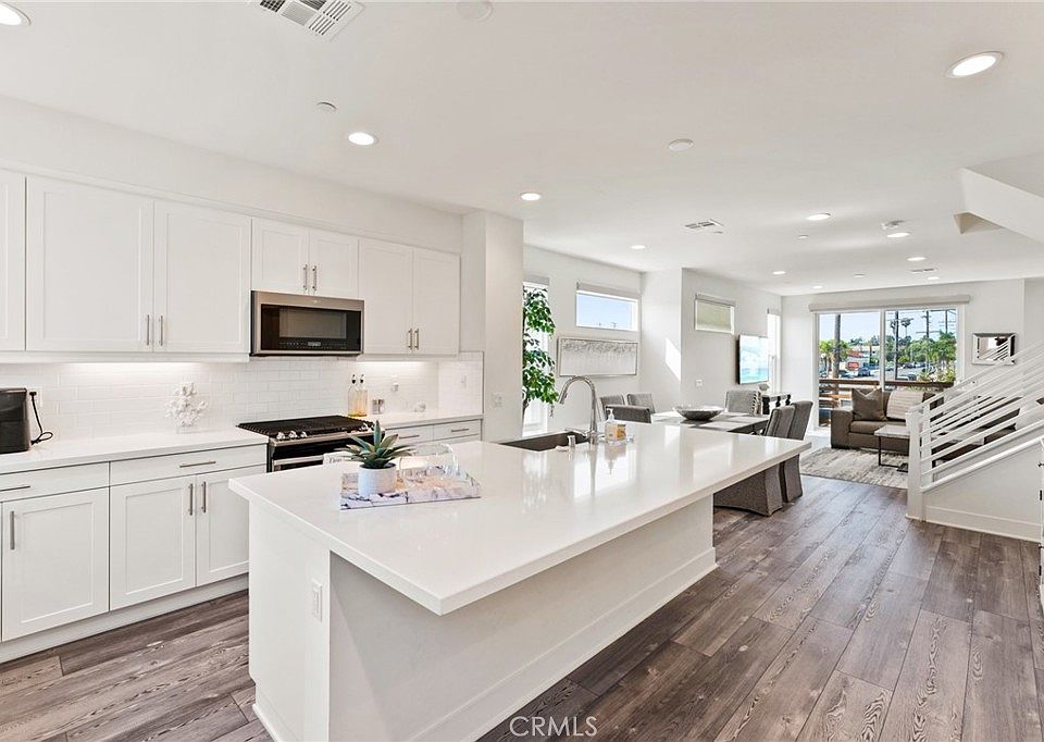 On the second level, an expansive open floor plan awaits, filled with natural light from abundant windows. The chef’s kitchen showcases a large center island with seating, crisp white cabinetry, Quartz countertops, and stainless steel appliances. Just off the kitchen, the dining area and spacious living room flow seamlessly onto a private balcony — ideal for entertaining or unwinding.