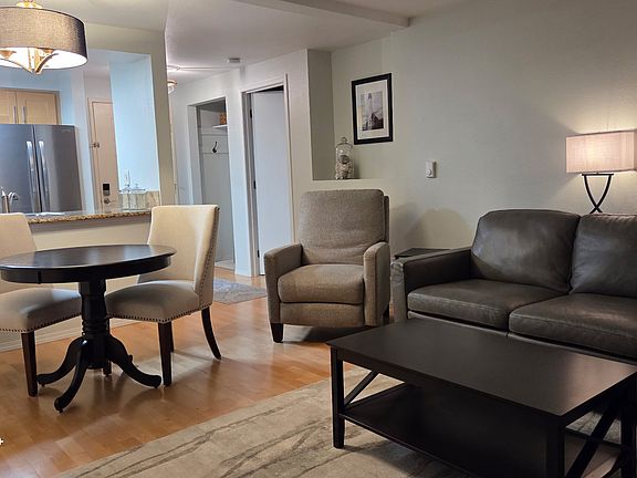 Modern and fully furnished 1-bedroom condo featuring an open layout, stylish lighting, and warm finishes throughout. The living room offers a comfortable sofa, TV, and dining area, while the kitchen includes stainless steel appliances, granite countertops, and plenty of storage.