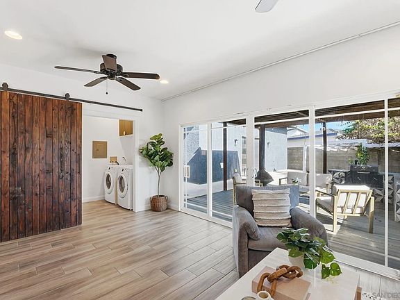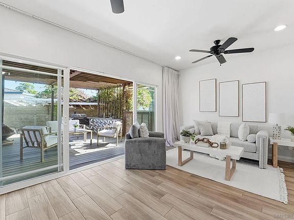 Discover this stunning 2 bedroom, 2 bath San Diego home featuring a versatile optional third bedroom perfect for modern living. An entertainer's dream awaits outdoors with a fenced grassy yard and a separate patio complete with a built-in fireplace and outdoor kitchen. A detached garage provides an incredible bonus space, ideal for a home office, gym, or extensive storage. Inside, updated matching solid flooring flows throughout the home, complemented by stylish space-saving barn doors and a convenient indoor laundry room. This property offers an exceptional location, situated moments from the University of San Diego and the Francis Parker School. Seize the opportunity to own this turnkey home that perfectly blends modern amenities with Southern California's indoor-outdoor lifestyle.
