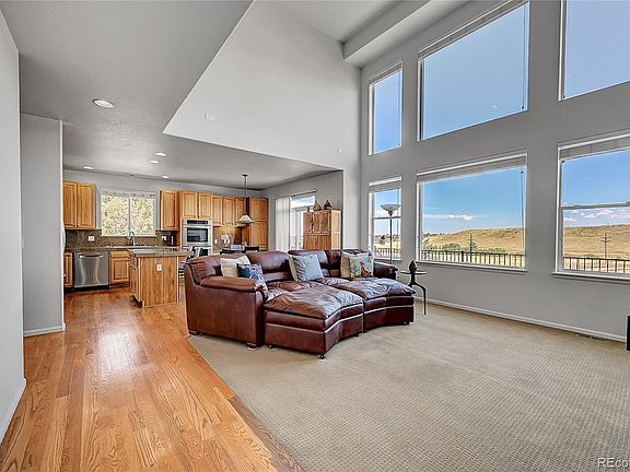 The heart of the home is the open-concept kitchen and great room, featuring soaring two-story ceilings and beautiful hardwood floors that flow throughout the main level. The kitchen boasts modern appliances, a large island and ample counter space, seamlessly connecting to the great room and creating a perfect gathering space. The main floor also includes a convenient bedroom, a 3/4 bath and a laundry room. Step outside to the large, expansive deck where you can enjoy spectacular sunrises and beautiful views all the way to downtown Denver and Chatfield Reservoir, making it an ideal spot for outdoor dining or simply relaxing. The second floor is a true retreat, with a spacious primary suite that includes a luxurious 5-piece ensuite bath and a huge walk-in closet. A catwalk leads to a versatile loft area and two additional bedrooms that share a full hall bath. The fully finished walk-out basement offers even more living space with a secondary family room, bedroom, 3/4 bath plus a large bonus room. This area is perfect for a guest suite, home office, or recreation room, providing endless possibilities. Fresh paint adds a crisp, modern touch. Outside, the front porch is a serene spot to unwind and take in the picturesque views of the foothills and hogback. This home is within walking distance to elementary schools, parks, trails, and more. It's just minutes from Roxborough State Park, Waterton Canyon & Arrowhead Golf Course, offering endless opportunities for outdoor activities. Don't miss your chance to own this exceptional home in the quiet and charming hamlet of Roxborough! https://v1tours.com/listing/52952