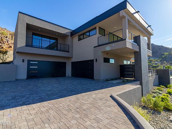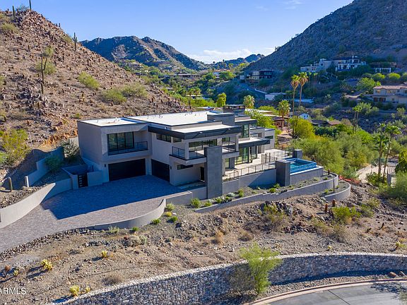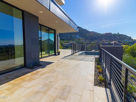 JUST COMPLETED & MOVE-IN-READY. This stunning hillside home located behind the 24/7 guard gated community of Paradise Reserve is a must see. This contemporary design build takes full advantage of the canyon views flowing out to Camelback Mountain in the forefront with the distant lighted skylines of Downtown Tempe west to Downtown Phoenix in the distance. This home site sits well above any lot overlooking these everlasting spectacular views. This well thought out design offers soaring ceilings & walls of glass to take advantage of every view possible. The Primary suite located on the main floor has private access to the infinity edge pool. Upstairs 3 guest rooms w/ exterior patios all offering different views or privacy. If desired there is a predesigned elevator shaft ready to convert.
