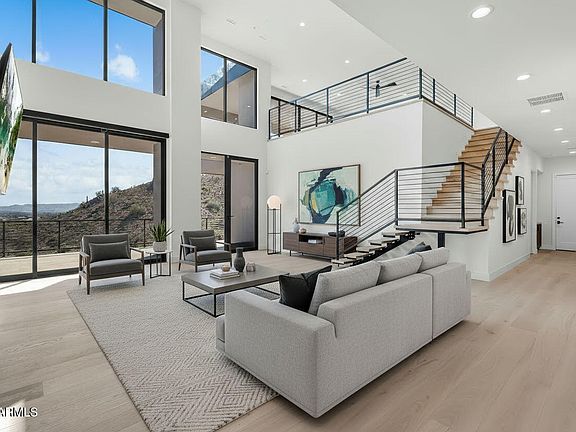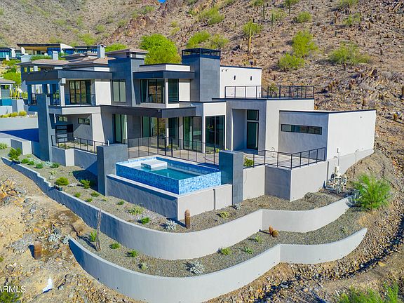 2025 NEW BUILD - MOVE IN READY - A serene hillside retreat nestled in a peaceful desert landscape located behind the private 24/7 guard gated community of Paradise Reserve w/ sbest view available in Paradise Valley. The Scenic Camelback mountain and city skyline views below open up from every point of this home, while modern sliding walls of glass create an ideal indoor-outdoor living experience. At the heart of the home is a designer dual-sided fireplace, a statement of elegance & warmth. The gourmet kitchen is equipped with premium Wolf & Sub-Zero appliances, Brizo plumbing fixtures, custom paint/rift white oak cabinets, & stunning quartz countertops. Warm wood floors from DuChateau's Martyn Bullard collection flow seamlessly across the open-concept layout, creating (CLICK MORE LINK) creating a warm, modern aesthetic. The master suite is the ultimate retreat, featuring an electric fireplace and natural light streaming in through large windows that frame stunning views. The spa-like master bath features double vanities, brass plumbing fixtures, a spacious shower, and a soaking tub. A spacious walk-in closet features custom cabinetry and built-in shelving by California Closets, a combination of elegance and function. Outside, a limestone-tiled deck leads to a captivating infinity-edge pool where the water seamlessly blends into the horizon.