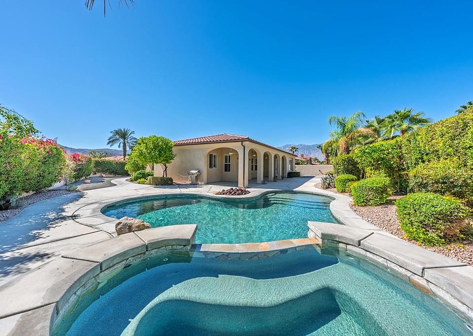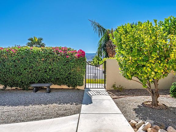 Move-in-ready and Owned Solar-power, this beautifully maintained home in the gated community of St. Augustine offers resort-style desert living on an oversized lot with pool and spa. Light-filled interiors flow seamlessly to outdoor entertaining spaces framed by mountain views. With a great floor plan and prime Rancho Mirage location--this is the perfect retreat for full-time or seasonal living. Welcome to this desert retreat located inside the sought-after gated community of St. Augustine in Rancho Mirage. This move-in-ready home sits on an oversized corner lot offering exceptional privacy mountain views and a resort-style backyard designed for true desert living. Through the gated private courtyard step inside to an inviting open floor plan with 2 bedrooms, Office/Den and 2 bathrooms, high ceilings, natural light, and generous living spaces create an effortless flow between the great room, dining area, and kitchen. The kitchen features white cabinetry, granite countertops, stainless-steel appliances and a large island perfect for entertaining. The spacious great room showcases a custom fireplace and a french door that leads to the expansive outdoor living area. Outdoors, you'll find the ultimate entertainer's oasis--complete with a sparkling pool and spa, fire pit, multiple lounging areas, and mature desert landscaping that perfectly complements the home's architectural lines. The property's OWNED solar system keeps energy costs low year-round. The primary suite offers peaceful separation, new carpet, a spa-inspired bath, and direct patio access for seamless indoor-outdoor relaxation. The guest room is a nice size also with new carpet and the flexible den/office (or 3rd bedroom) provides space for remote work or hobbies. A two-car garage and ample driveway add convenience, while the home's pristine condition means there's nothing left to do but move in and start enjoying the best of desert living. St. Augustine is a prestigious Rancho Mirage community known for its walking paths, tennis and pickleball courts, and lush greenbelts--all surrounded by mountain vistas and just minutes from world-class golf, dining, and shopping along El Paseo.