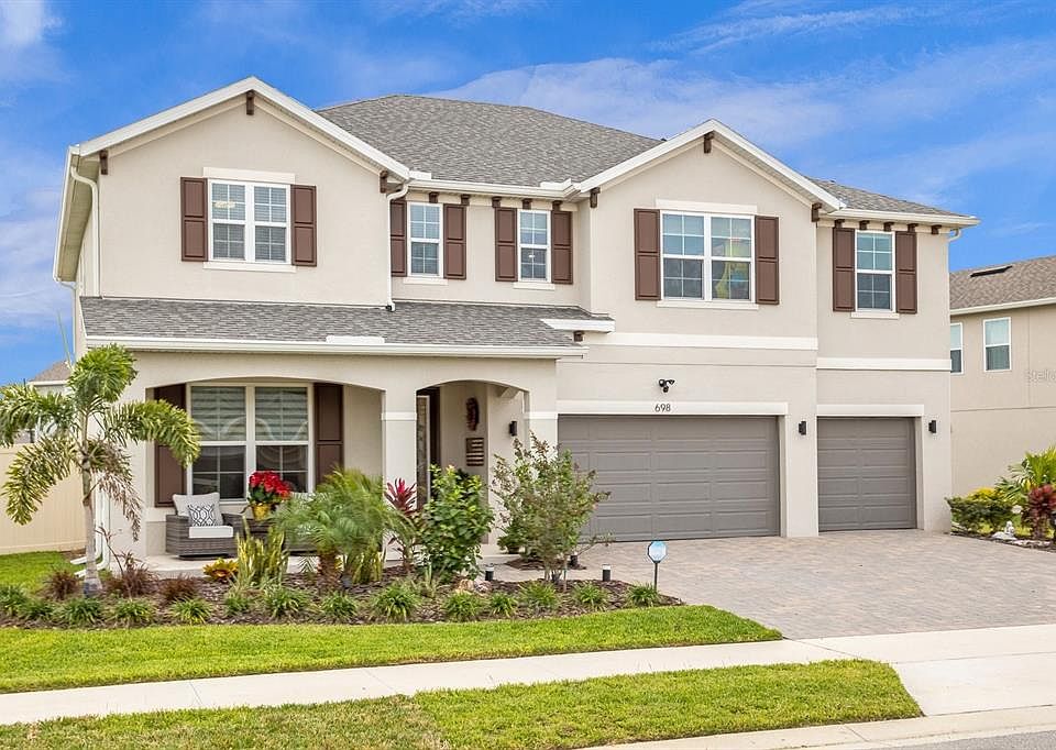 Beautifully appointed home in highly desirable Park View at the Hills in Minneola! Almost new home with so many features and upgrades. Near 12,000 sq ft, fully fenced, premium lot adjacent to the Park and Community Pool. Gorgeous landscaping including 14 palm trees, concrete border, 320 sq ft extended lanai and 180 square ft adjacent concrete patio. The interior features a stone ledger accent wall in the dining room, Mohawk Revwood flooring throughout, custom stair railings, motorized blinds, two panel doors, walk in closets in each bedroom, three linen closets, two coat closets, nine ceiling fans, 1st floor full bath attached to the guest/in-law bedroom, pre-wired power for TVs etc... The gourmet kitchen has an amazing eight person quartz top island, GAS cook top, oven/microwave combo, Samsung Refrigerator with Family Hub, 42" full overlay cabinets, two pantry closets, etc... The primary bedroom suite has tray ceiling, deluxe ceiling fan with twelve blades, attached full bath with oversized shower and dual vanities, walk in closet with wood shelving. Huge media room with built in speakers ready for your home theater set up. This home has solar panels, fully paid and will $AVE you HUNDRED$ per month off your electric bill. Owner is licensed RE Broker in Florida Room Feature: Linen Closet In Bath (Bedroom 5). Room Feature: Linen Closet In Bath (Primary Bedroom).