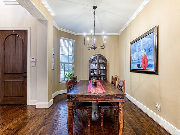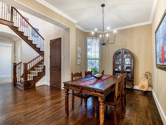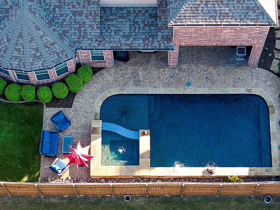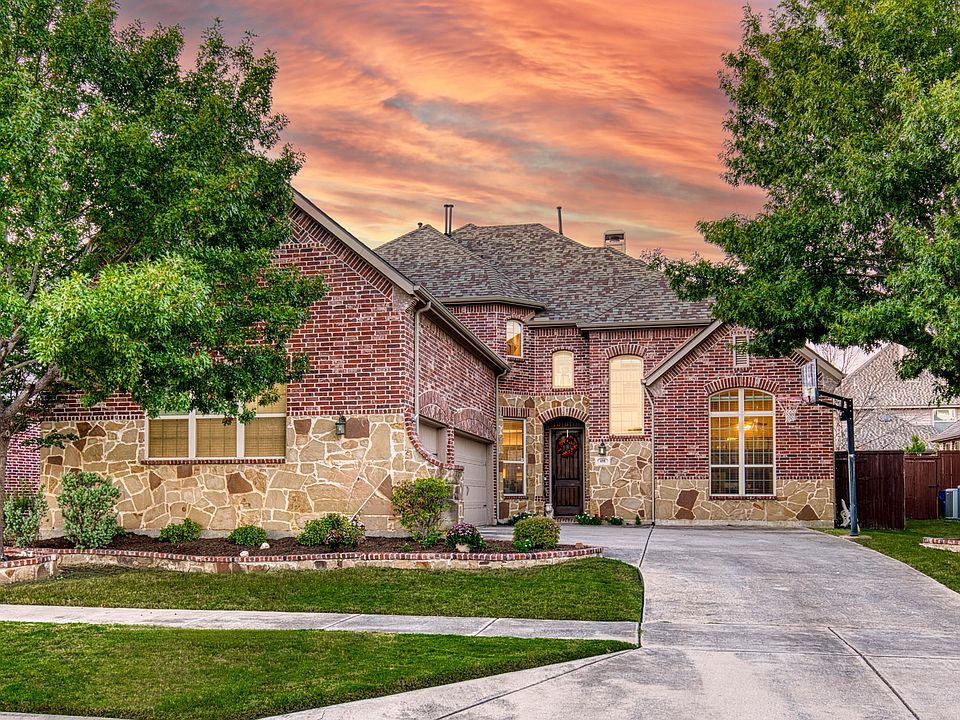 Welcome to this exquisite residence nestled in the desirable Stonewater Crossing community of Frisco. This stunning home offers 3,575 sq ft of refined living space with timeless design & modern comfort. Step inside to a grand entry leading to an open-concept living area highlighted by soaring ceilings, hand-scraped hardwood floors & a gas stone fireplace that creates a warm & inviting ambiance. The chef’s kitchen features granite countertops, a large island with 2025 pendant lighting, pristine white cabinetry, stainless steel appliances, gas cooktop, walk-in pantry & a charming breakfast area with a wall of built-ins including a desk plus a 2025 chandelier all overlooking the backyard oasis. The luxurious primary suite is a serene retreat offering a spa-inspired ensuite bath with dual vanities, a soaking tub, an oversized shower & an expansive walk-in closet. The formal dining & private office complete the main level with both elegance & functionality. Upstairs, a spacious game room & media room with 100 inch screen & projector provide perfect spaces for entertainment & relaxation, accompanied by 3 well-appointed secondary bedrooms with walk-in closets plus a full bath & a Jack-and-Jill bath. Outdoors, enjoy your private resort-style backyard with a large covered patio with motorized solar screens on remote overlooking the sparkling pool & spa, cascading water features, lush landscaping, and dedicated lounging areas, ideal for entertaining or unwinding. The oversized three-car garage with epoxy floors adds the finishing touch to this meticulously maintained home. Residents of Stonewater Crossing enjoy premier amenities including a community pool, playground, scenic greenbelt, 2 lakes with fountains & beautifully manicured common areas. Located in Frisco ISD near top shopping, dining, & entertainment, this home combines luxury, location, & lifestyle in one exceptional package. 2022 roof. It’s time to make this house your new home! Search address in YouTube for video.