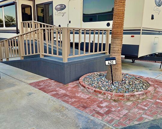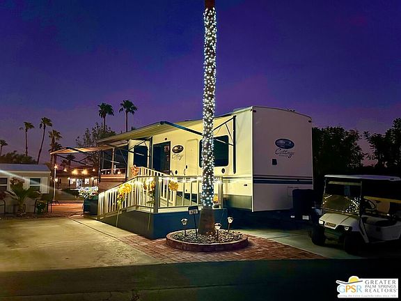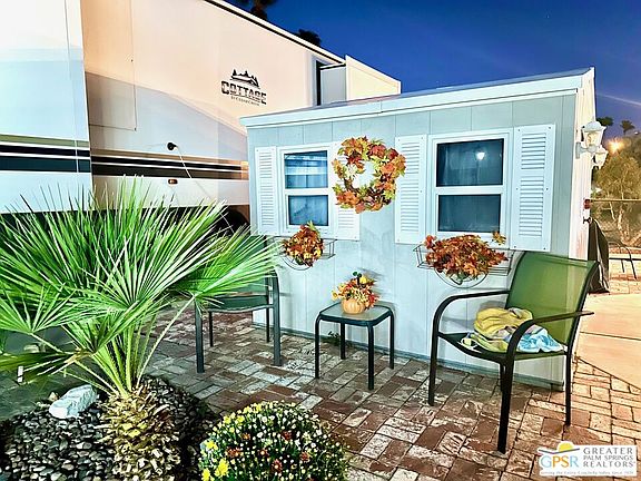 Premium Lot in Desert Shadows RV Resort, a premier 55+ seasonal community just minutes from Palm Springs shopping, dining, and golf. Sold as a package with a beautifully maintained 2018 Cedar Creek Cottage. Cottage offers upgraded features throughout, including a washer and dryer, dishwasher, double-door refrigerator, bedroom ceiling fan, second air conditioner, and a 12-foot electric awning with lights. Additional stabilizer jacks and other extras are already in place. The queen bedroom connects to a full bathroom with a residential toilet, and the home is hard-plumbed to water and sewer eliminating the need for tank dumping or outside hookups. Set on a fully concrete lot with a storage shed, the property overlooks a serene pond that attracts native birds, providing a peaceful setting for relaxing or entertaining on the private patio. The HOA dues are a low $420 per month, which includes access to all resort amenities and events, premium cable, Wi-Fi, water, trash, sewer, a recycling program, and landscaping in and around the unit. All the comforts of home are waiting for you in this desirable 55-plus resort community. *Owner will consider carrying loan for buyer.